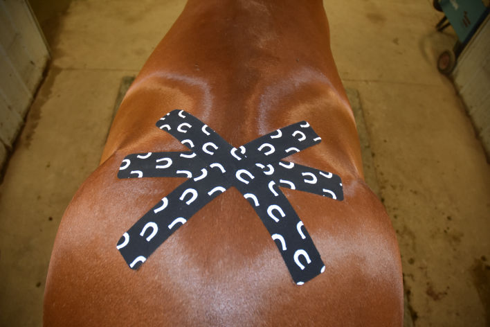 Dr. Adams uses taping techniques from Rocktape FMT (Functional Movement Techniques) Equine, which emphasizes functional kinesiology taping methods to reduce or control pain, manage swelling or edema, increase joint range of motion, and improve muscle function, as well as influence the horse's way of going.